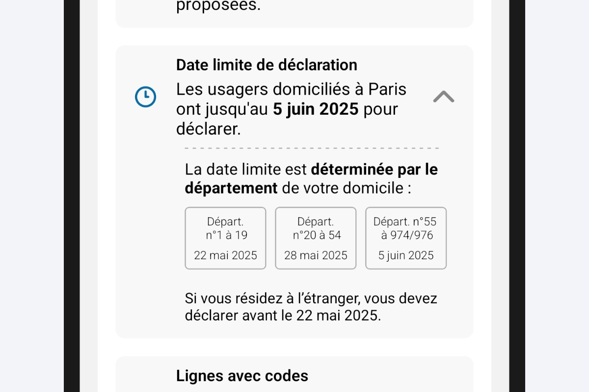 - Ici, la rubrique « Date limite de déclaration » indique la date limite de dépôt pour votre département ainsi que celle des autres départements et des résidents français à l'étranger.