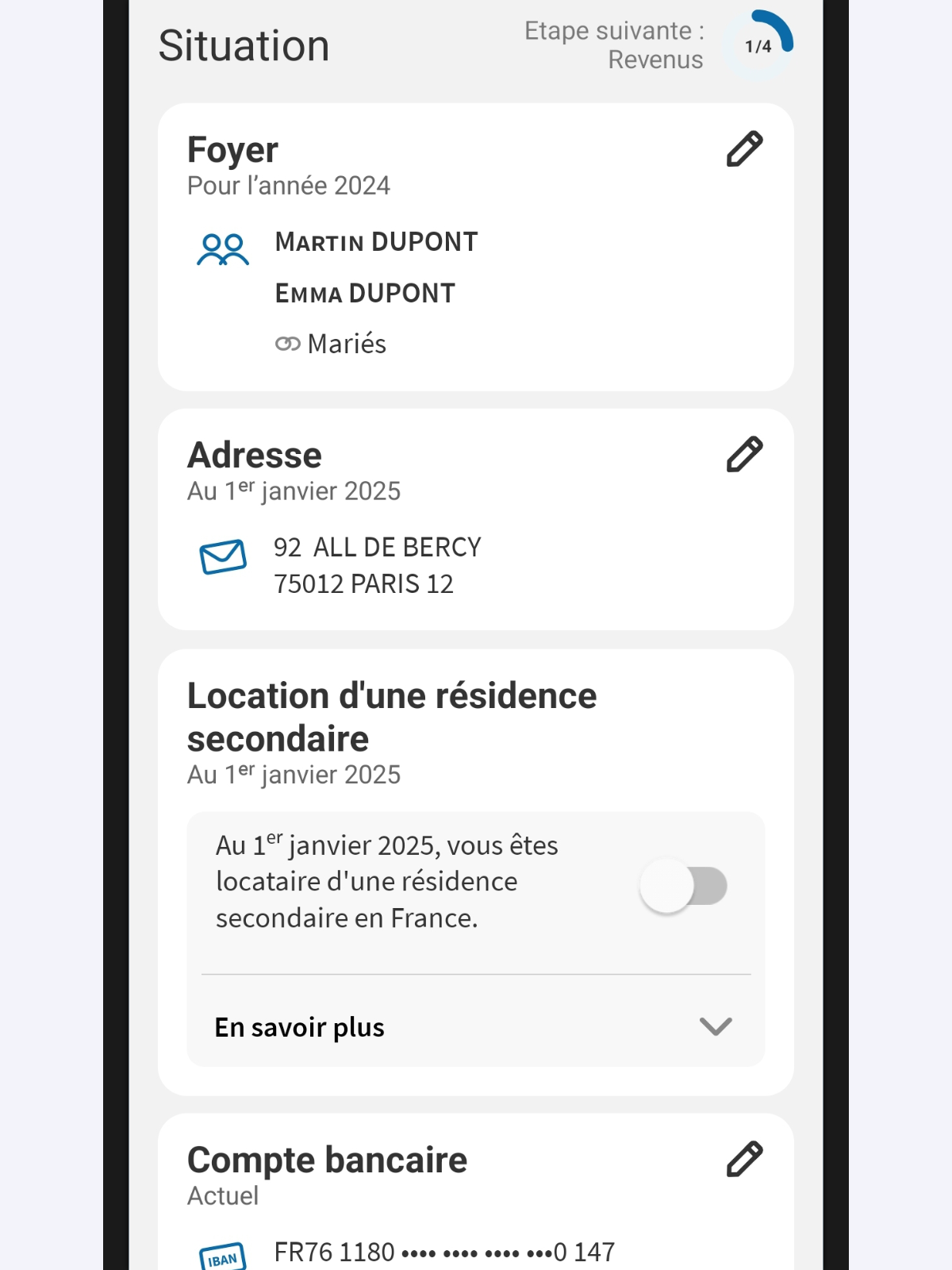 - La page « Situation », première étape du parcours, présente les informations connues de votre foyer (situation de famille, personnes à charge), de votre adresse, et de votre compte bancaire.