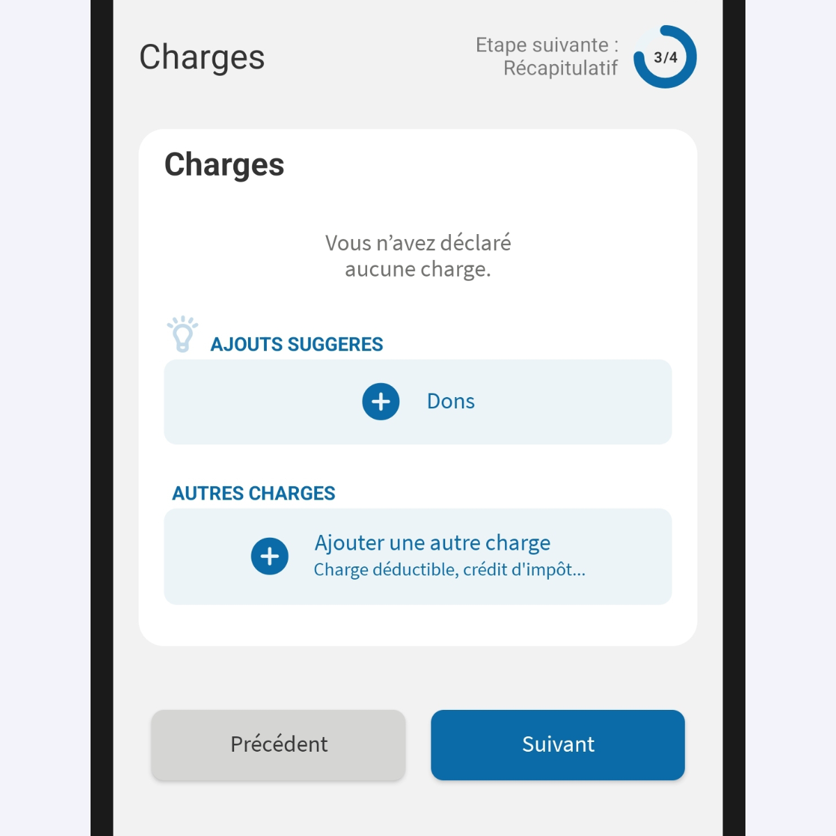 - Un appui sur le bouton « Suivant » permet d'accéder à la troisième page du parcours déclaratif, la page « Charges ».