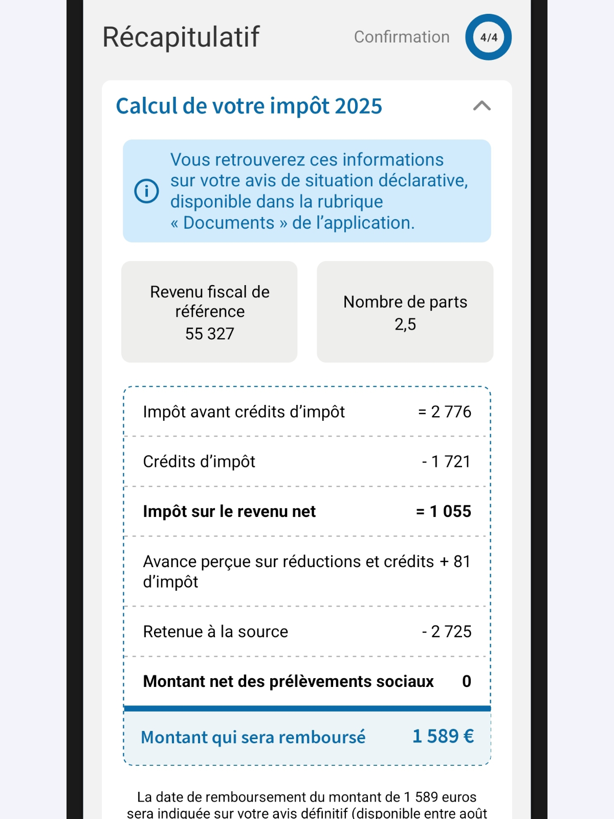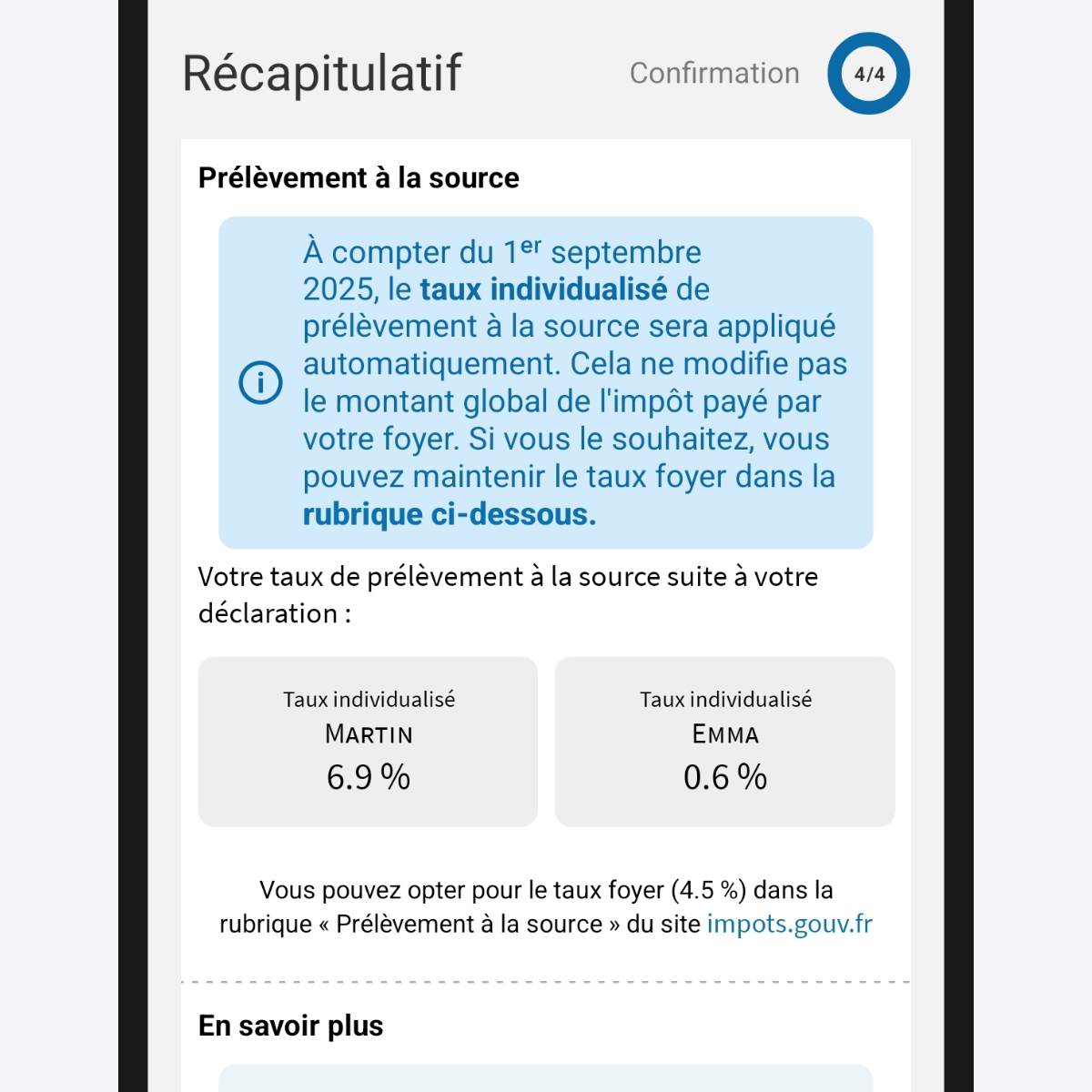 - Suite aux éléments déclarés, la page « Récapitulatif » affiche également le taux de prélèvement à la source actualisé (ainsi que les acomptes éventuels).