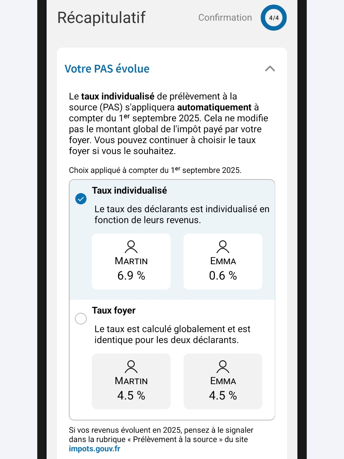 - Au titre de la campagne 2025, pour les contribuables mariés ou pacsés, la rubrique « Votre PAS évolue » permet d'opter pour le maintien du taux foyer de prélèvement à la source ou pour le taux individualisé (désormais applicable par défaut).