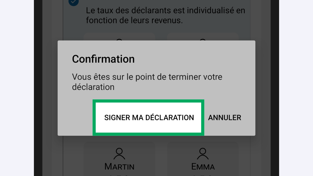 - Pour signer votre déclaration, appuyez sur le bouton « Valider », puis sur « Signer ma déclaration » dans la fenêtre de confirmation qui s'affiche.
