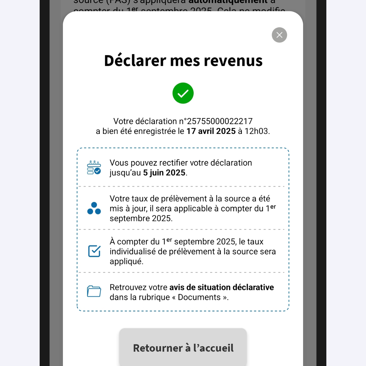 - Votre déclaration a bien été enregistrée. Vous pouvez retrouver la déclaration effectuée, un accusé de réception ainsi que votre avis de situation déclarative dans la rubrique « Documents » de l'application.