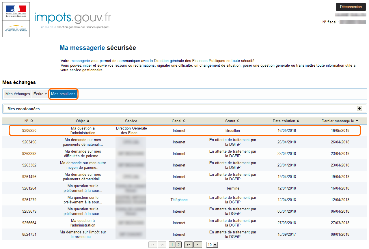 Pour finaliser un message préalablement enregistré en brouillon, l'usager peut cliquer sur la ligne correspondante ou sur « Mes brouillons ».
