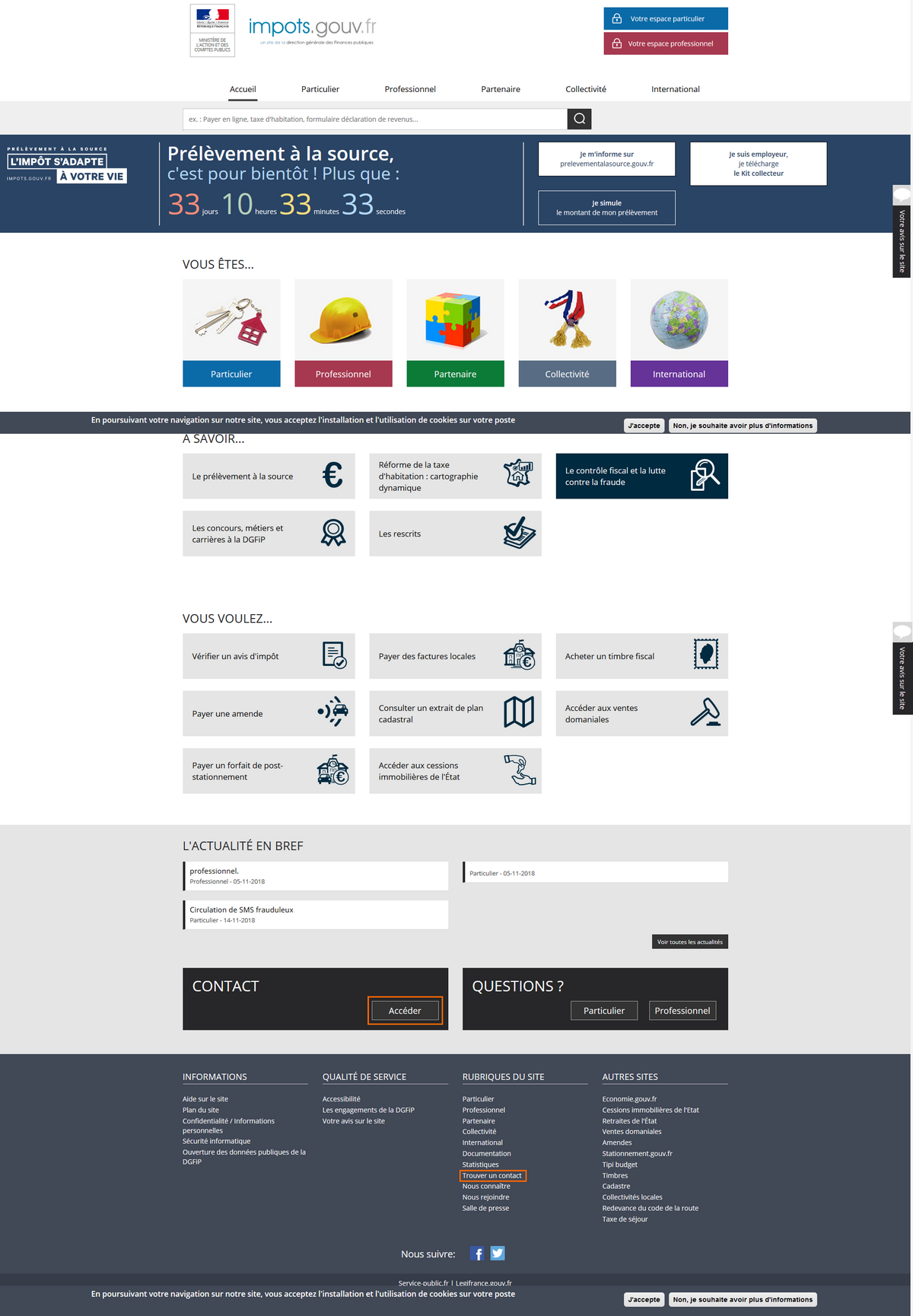 Pour rechercher les coordonnées d'un service, en bas de l'écran, cliquer sur « Accéder » dans la rubrique Contact ou sur « Trouver un contact » dans la liste des rubriques du site.