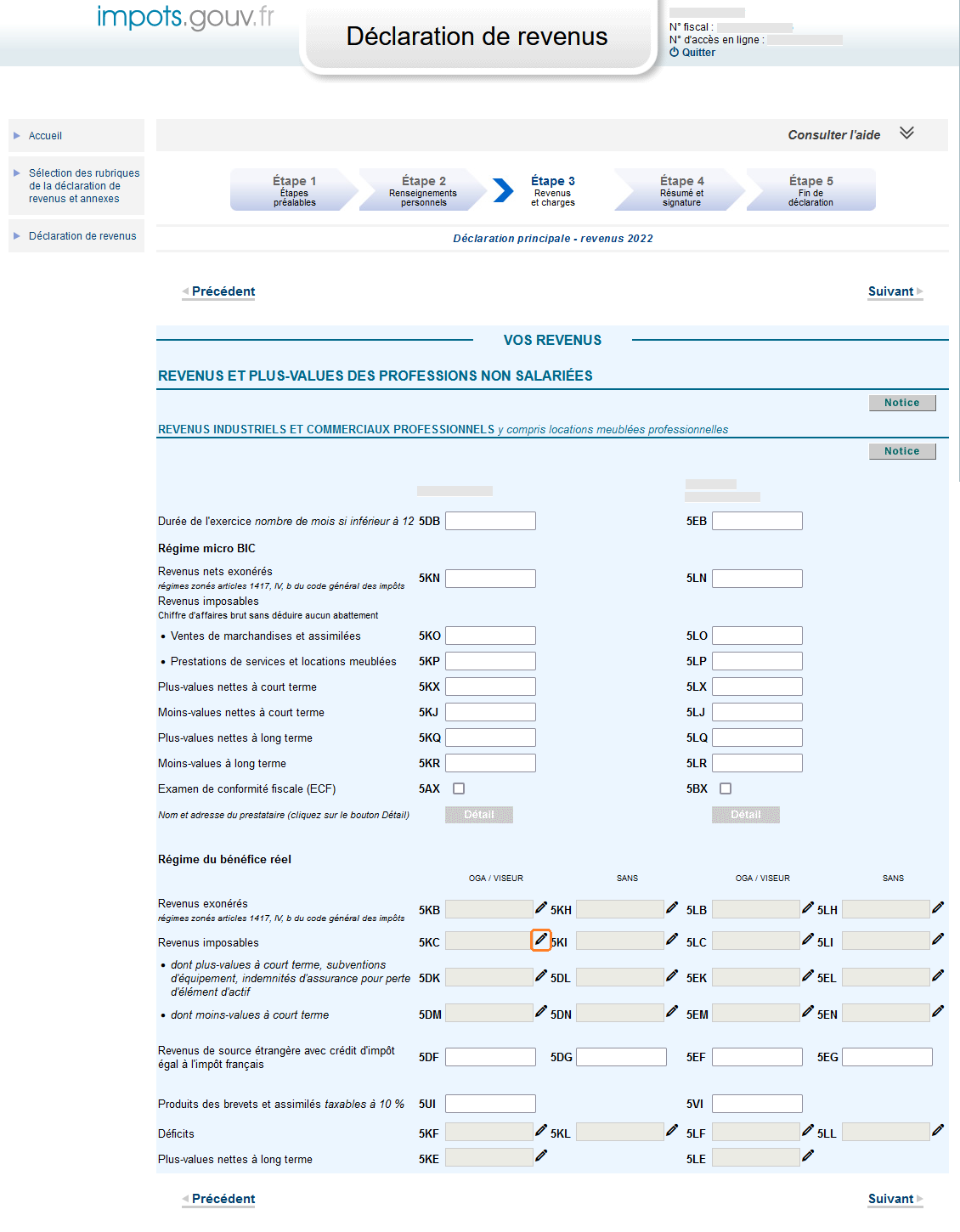 permet d'accéder au détail et de modifier les montants (ici le montant des revenus imposables).