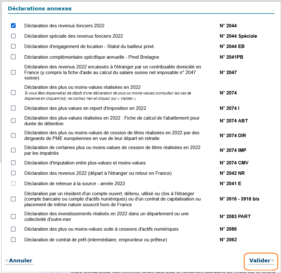 supprimer une déclaration annexe, l'usager doit décocher la déclaration annexe précochée puis cliquer sur Valider.